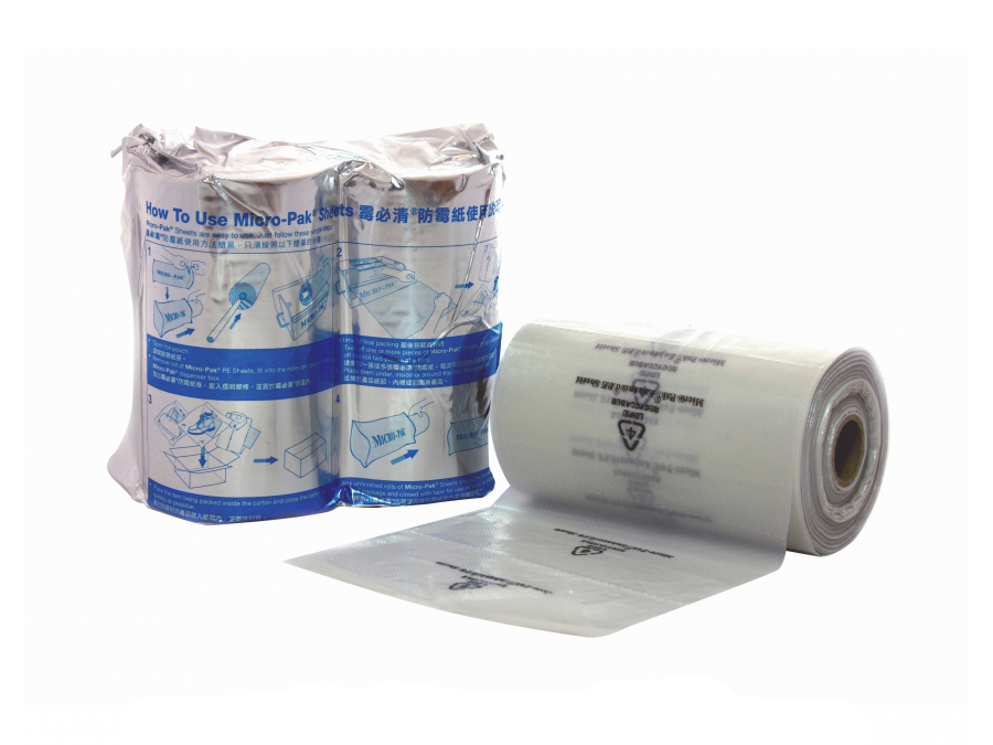 Anti-microbial PE packaging sheets fromMicro-Pak®are safe, effective, easy to use and unobtrusive. Place Micro-Pak® Sheets inside poly bag packaging to ensure goods stay mold-free. The moment relative humidity in your bag nears the danger zone, these sheets go to work eliminating mold spores by releasing an anti-microbial atmosphere within the package. This unique humidity-based activation ensures your goods are protected from the threat of mold growth for extended periods of time. Third party lab tests show continued activity for more than five months.